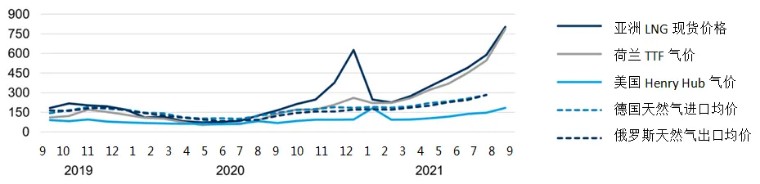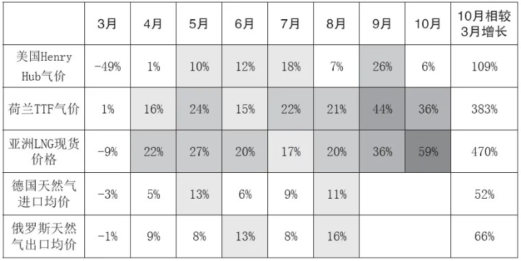 2021年3月~10月全球天然氣月均價(jià)格變化情況