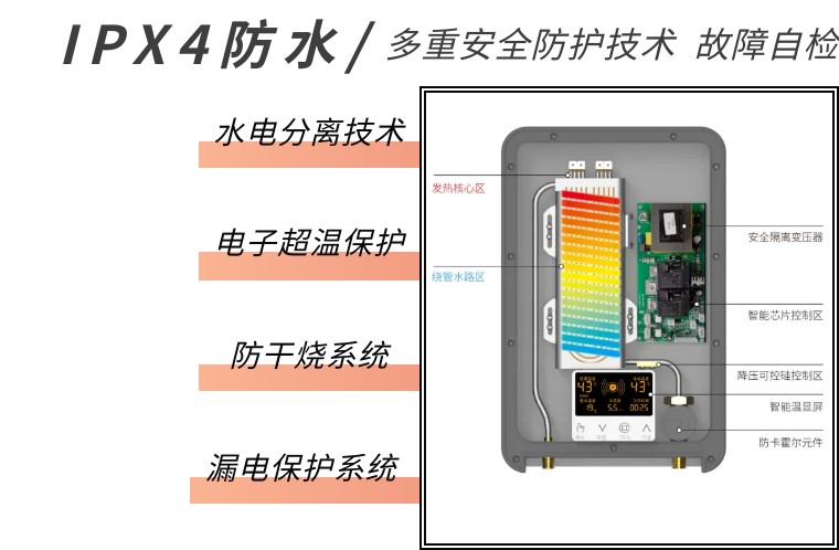 同時,機器還特設(shè)多重安全防護技術(shù),搭載水電分離技術(shù)、電子超溫保護、防干燒系統(tǒng)、漏電保護系統(tǒng)等各項安全防護措施,用每一個貼心細節(jié)呵護你的沐浴安全。