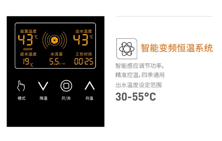 30-55℃寬域調(diào)溫,配合智能數(shù)顯面板,實時可見水流量和進出水溫變化,有效控制出水溫度,給家人帶來一年365天的溫暖舒適熱水。