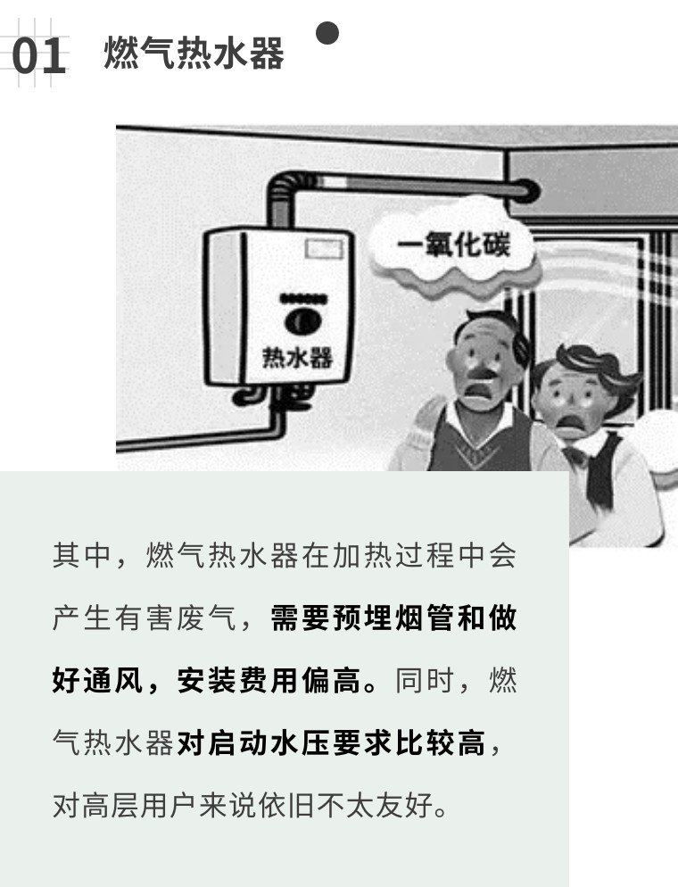 燃?xì)鉄崴鞅仨氀b在空氣流通的地方,對(duì)于安裝位置的限制性比較大。但這樣就會(huì)與浴室距離較遠(yuǎn),形成較長(zhǎng)的冷水段,每次使用時(shí)都得將冷水段里的冷水全部排光才能出熱水,極易造成水資源浪費(fèi)。