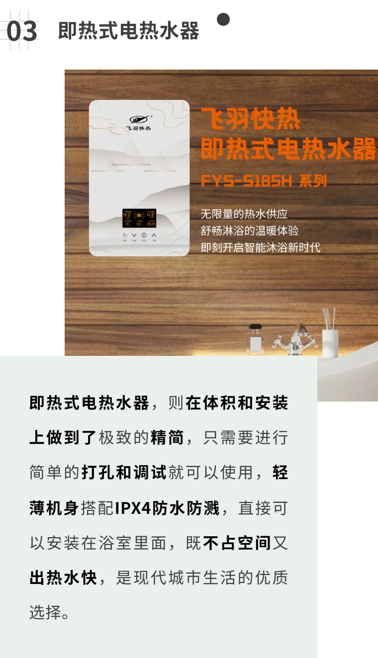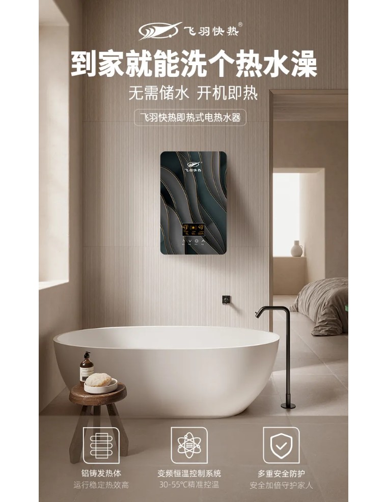 例如這臺(tái)飛羽快熱即熱式電熱水器,采用一體式全鑄鋁加熱體,無(wú)需儲(chǔ)水,即開(kāi)即熱。不受天氣和光照的影響,洗澡時(shí)僅需開(kāi)啟花灑,澎湃熱力,頃刻既達(dá),享受想洗就洗的暢快。