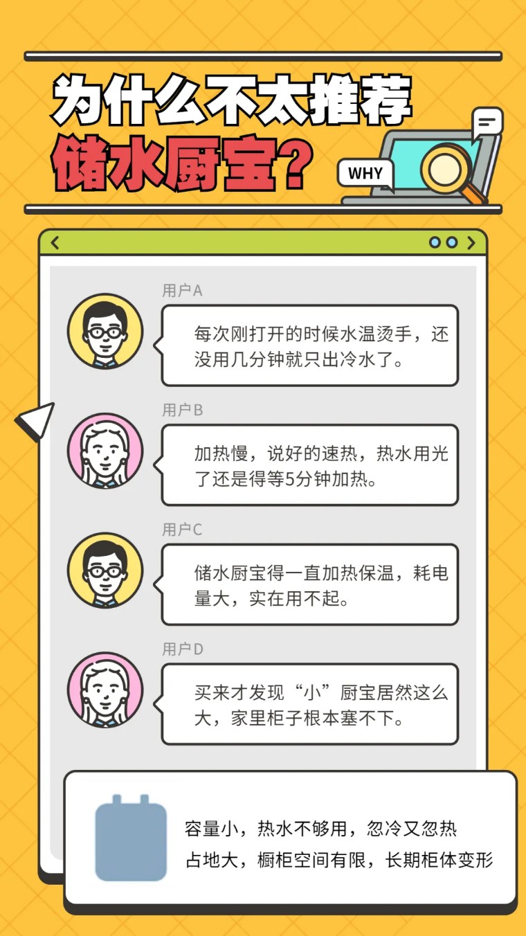 而且許多用戶使用后反饋,儲水式小廚寶的能耗很高,為了保持水溫,內(nèi)膽里的水不斷被反復加熱,家里的電費都在蹭蹭蹭得上漲。長時間工作,機器的壽命也被縮減。