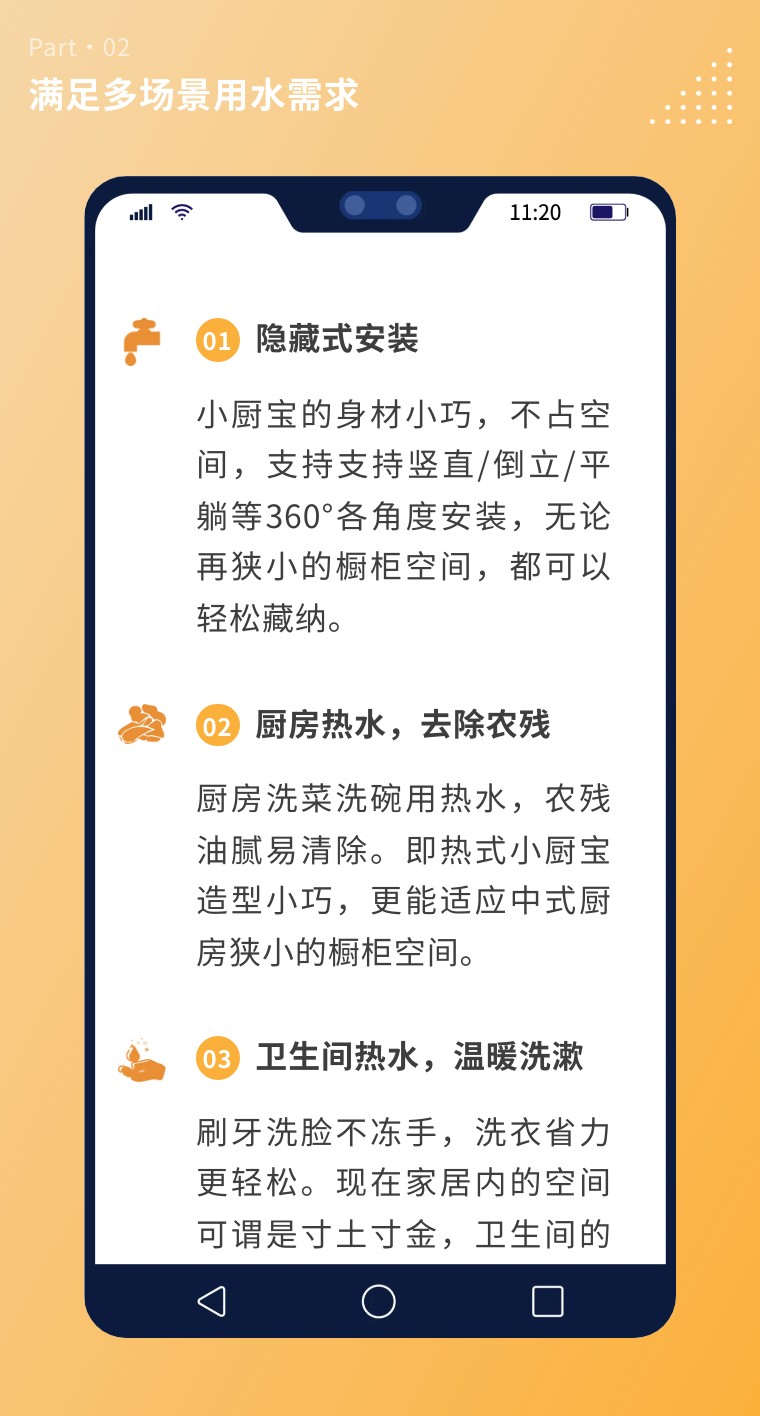 即熱式小廚寶既可以用于洗手、刷牙這種多頻次、用水少的短時(shí)熱水,也可以滿(mǎn)足洗碗洗衣服這類(lèi)長(zhǎng)時(shí)間、大水量用水需求。靈活適用多種場(chǎng)合,沒(méi)有熱水用量限制。搭載的變頻恒溫系統(tǒng),不僅可以恒定水溫,也可以用作熱水器補(bǔ)熱,省電省水,提升體驗(yàn)。